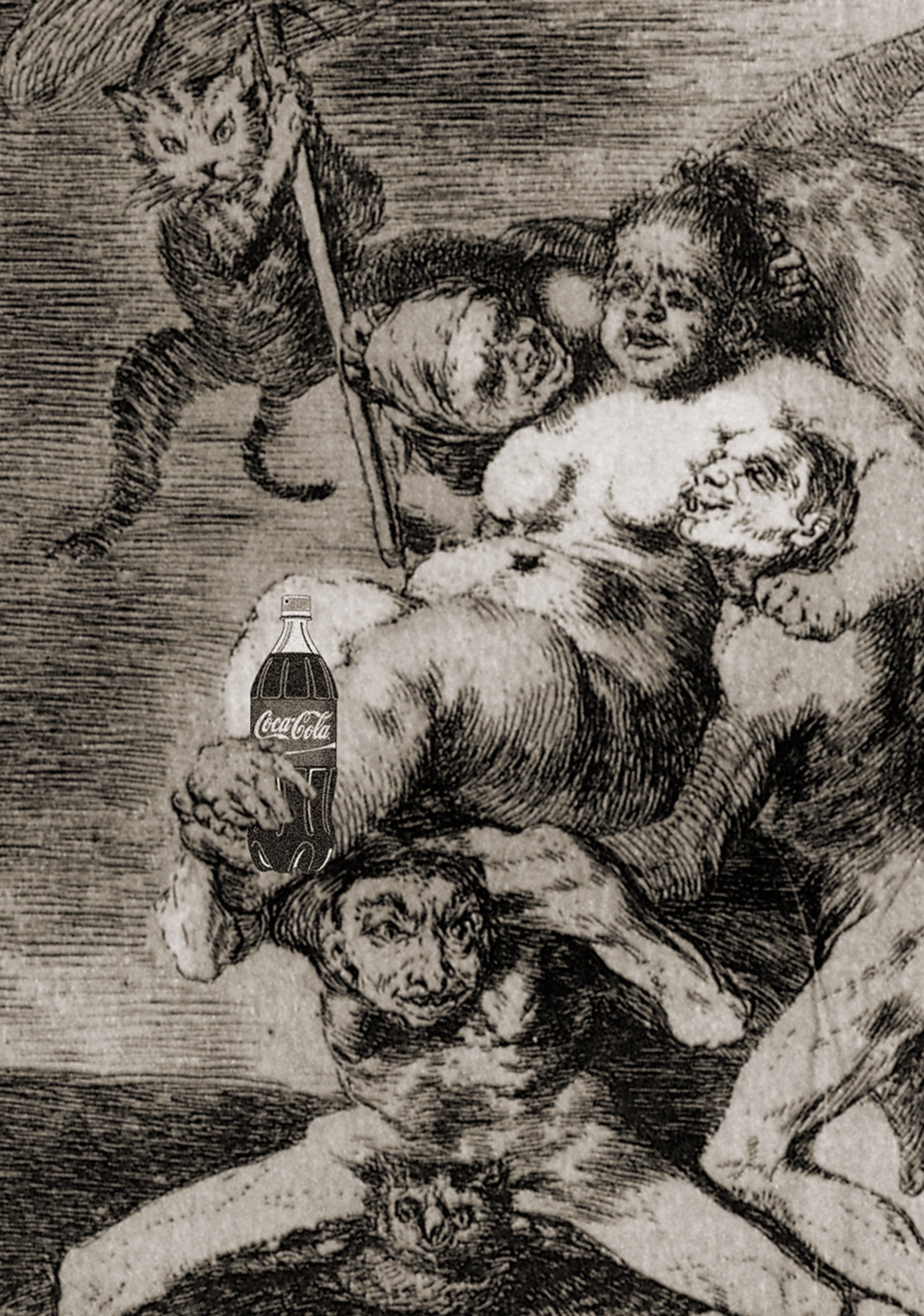 Here a famous Goya print is reworked, now with the introduction of a coke within the scene. If Francisco De Goya were here today I am certain he would approve.